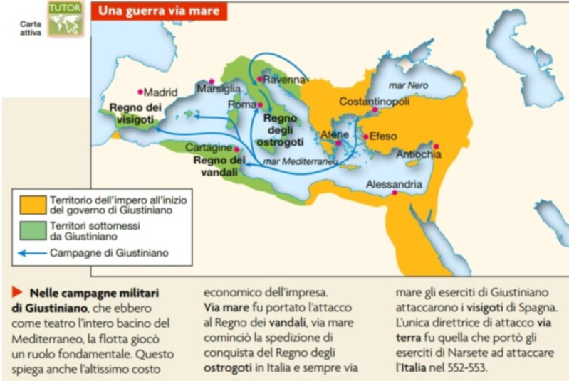 La prima cartina mostra l'andamento della riconquista dell'Occidente da parte di Giustiniano: le frecce blu sono le direttrici delle campagne dell'Imperatore, i territori verdi le zone dell'Ex Impero d'Occidente, ormai diviso nei diversi regni romano barbarici, effettivamente "riconquistati". Il Regno dei Visigoti (una sua parte), Il Regno dei Vandali, e il difficile Regno degli Ostrogoti in Italia. Come si vede, per quanto immane il suo sforzo, anche all'apice della campagna, Giustiniano è ancora ben lungi dall'aver ricostitituito territorialmente il vecchio Impero d'Occidente. Manca gran parte della Spagna, la vecchia "Gallia" e in generale tutta la parte continentale dell'Europa. Fra i Regni neppure sfiorati da Giustiniano c'è quello dei Franchi, che nel frattempo cresce e si consolida come unità sempre più definita. I Longobardi viceversa non sono ancora scesi dal Nord Est dell'Italia all'interno della penisola, come si incomincia a intravedere nella seconda cartina.